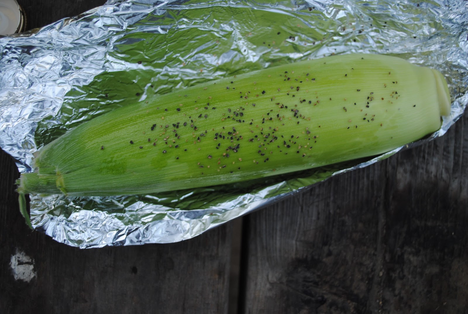 For the corn: With the husks on, douse the corn in some olive oil and wrap them in tin foil. Place over the fire for about 30 minutes